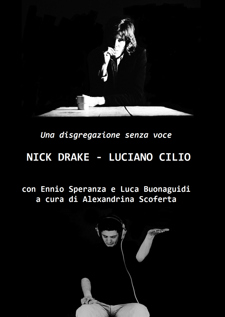 C’è una linea sottile che unisce la disgregazione senza voce delle loro vite e delle loro musiche. E di quella linea io, Ennio Speranza e Alexandrina Scoferta vi parleremo venerdì sera. Attraverso i nostri libri e i nostri ascolti delle loro canzoni: “Nick Drake. Una disgregazione” di Ennio Speranza e “L’urlo. I suoni senza voce di Luciano Cilio” di Luca Buonaguidi, Girolamo De Simone, Fabio Donato, Salvatore Setola.