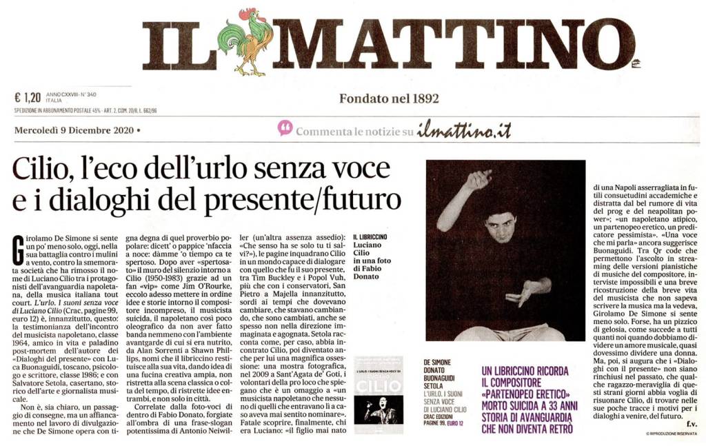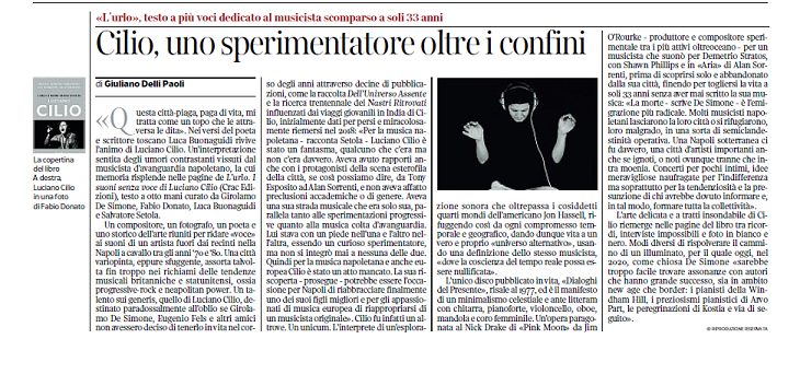 Il mio, il nostro ultimo libro, da fine ottobre in libreria per Crac Edizioni, ha ricevuto in questi mesi una serie di articoli su quotidiani nazionali e riviste specializzate, che segnalo qui per chi fosse interessato. Il nostro libro, perché scritto con grandi amici e maestri come Girolamo De Simone, Fabio Donato, Salvatore Setola. Si chiama “L’urlo. I suoni senza voce di Luciano Cilio”. Ne hanno scritto, apprezzandolo, storiche firme della critica musicale come Gino Dal Soler, Federico Vacalebre, Alessandro Besselva Averame e altri. Le recensioni cartacee le potete visionare in foto, delle principali uscite sul web i link di seguito.