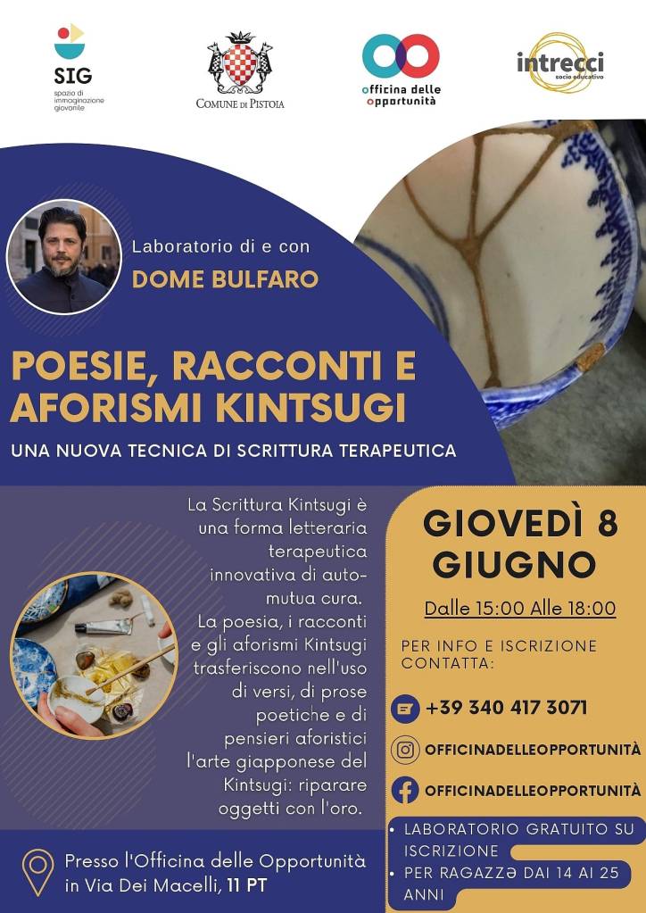 Detto che giovedì presentiamo Poesia e Psiche, prima l’indomito Dome Bulfaro terrà sempre a Pistoia un laboratorio gratuito di Poetry Therapy utilizzando uno strumento di sua invenzione, per esplorarsi ed esprimersi. Le poesie kintsugi nascono dall’unione dell’arte del kintsugi con l’haiku e con la poesia occidentale… E poi tutti in libreria alle 18.30, con noi, Rilke e gli altri fuoriquota!