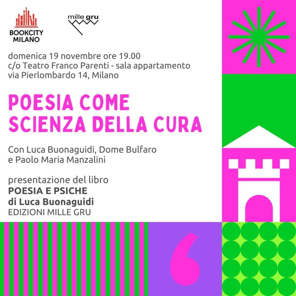 Domenica sarò a Milano con il mio libro Poesia e Psiche per un secondo incontro in città, da BookCity al Teatro Franco Parenti. Con me e Dome Bulfaro stavolta ci sarà il Dott. Manzalini, psichiatra, psicoterapeuta e dirigente medico dell’ospedale di Desio Vimercate. Sempre lieto di parlare di poesia come altra scienza per la cura.
